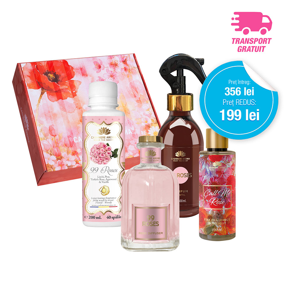 O descoperi în 3 iterații diferite: parfum de rufe, parfum textile și parfum de cameră, bucurându-te de asemenea de un spray parfumat de corp sublim, Call me Rose, creat din ingrediente extrem de similare. Vestea cea mai bună? Găsești acum pachetul la un preț incredibil, alături de transport gratuit și livrare super-rapidă. Alege astfel să nu îl ratezi, ar fi păcat.