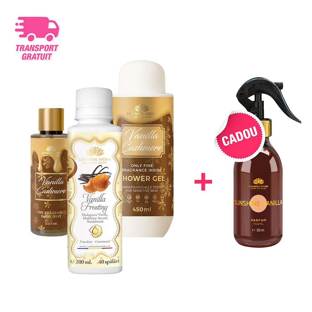Vanilia de Madagascar, fursecul franțuzesc și lemnul de santal din parfumul de rufe Timeless Aroma Boost Vanilla Frosting. Vanilia cremoasă, moscul alb și caramelul senzual din spray-ul de corp și gelul de duș Vanilla Cashmere. Două „rețete” diferite, trei produse separate, același obiectiv: acela de a te ajuta să îți îmbraci pielea în aromele favorite, pe care să le poți purta de asemenea, întipărite în fiecare accesoriu vestimentar preferat!